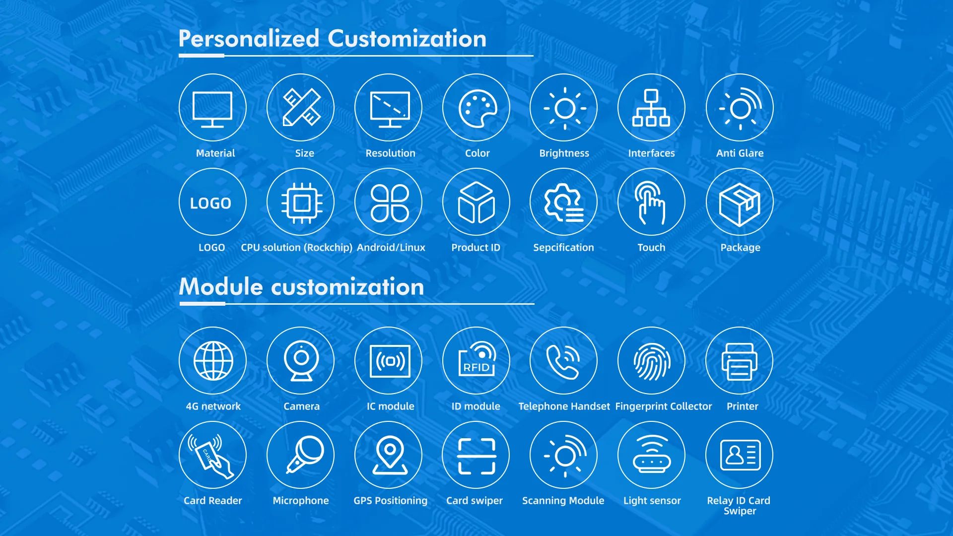 1. PCBA design2. Housing design3. Software and hardware customization4. Logo print on housing5. Software customization: Booting image, Boot animation,UI, Launcher, APP, Function6. Good quality products 7. full after-sales service with technology support 8.100% QC check before shipping