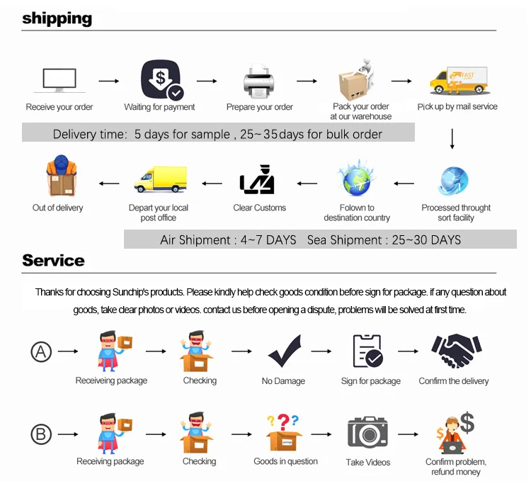 1) Q: Is SUNCHIP a factory or simply a trading company? A: We are a TRUE OEM/ODM factory. Please read our COMPANY PROFILE, for more information on this issue. 2) Q: What payment methods are available to me? A: We accept most of the payment methods: accept VISA, Pay Later,T/T,Western Union,Paypal and Cash. 3) Q: How long is the warranty time? A: 1 Year. 4) Q: What are the shipment terms and delivery times of your company? A: Delivery / production time is directly affected by the size of the order. Also depending in which season you are shipping. 5) Q: Do you give any discounts ? A: Prices are directly affected by the quantity. We have many ways to help our partners when starting the sample processes. Make sure to ask our sales on how we can make you save some charges. 6) Q: I would like to add my company logo on your products, is this possible? A: SURE.We customize on a regular basis products for many large retailers and brands. If your order is at the below 10 units, we can consider this as a SAMPLE order, some fees might apply for the logo prints.