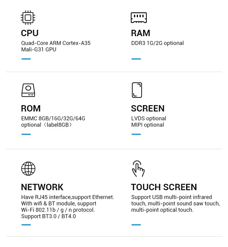 We mainly manufacture1, Android industrial Embedded board: RK3588, RK3566, RK3568, RK3288, RK3399,RK3328, RKPX30, RK3188, RK3128 etc.2, 銆�4K銆慉ndroid media player box for digital signage advertising: RK3399, RK3288, RK3328.3, 銆�8K銆慉ndroid Player Box for Industrial-Control Application: RK3588.4, Stretched lcd Display signage, support ODM.5, Open frame LCD display signage: 8inch, 10.1inch, 13.3inch, 15.6inch, 21.5inch etc.6, SKD Kit: Android board + LCD panel with touch or not:7inch, 8inch, 10.1inch, 13.3inch, 15.6inch.7, Other types of Wall Mounted / Floor Standing / Desktop LCD digital signage.8, Embedded touch desk: such as 32inch.9, Face recognition temperature detection terminal machine: such as 8inch.[you can also tell us your requirements, so that we advise you a matched solution]